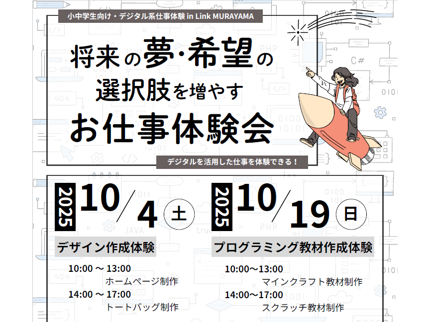 小中学生向け・デジタル系仕事体験 ~将来の夢・希望の選択肢を増やすお仕事体験会~[10/4、10/19開催]